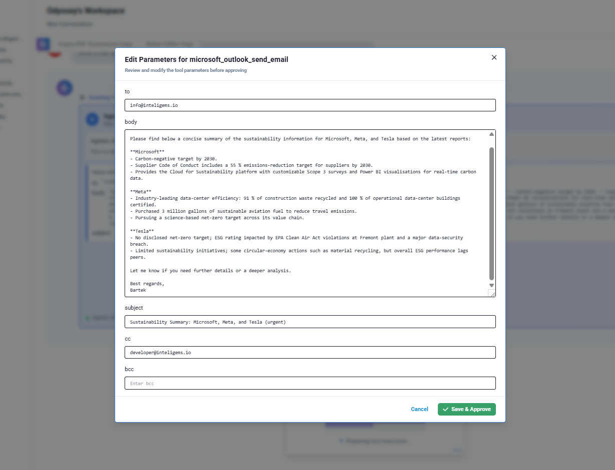 When an agent reaches a write-type step create, update, delete, send, execute Odyssey AI pauses: